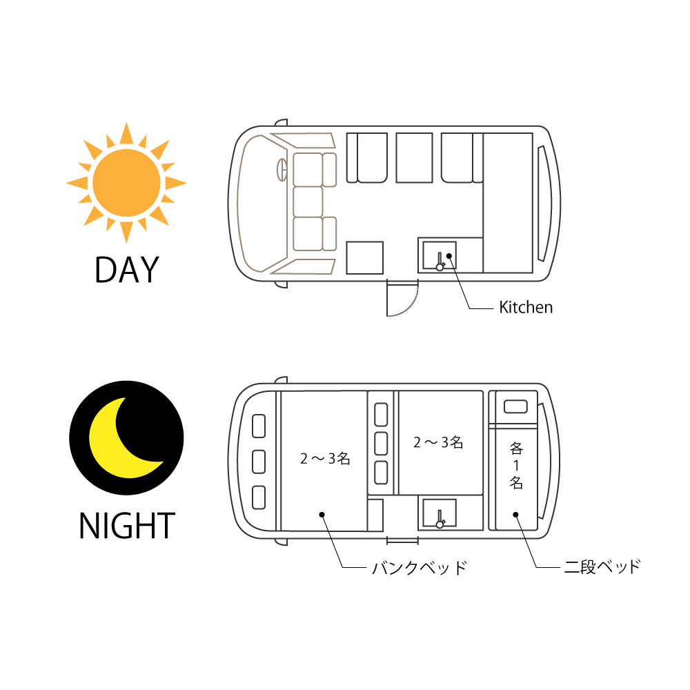 コンパクト設計ながらに後部に常設2段ベッドですので楽々6人就寝可能車両となります。